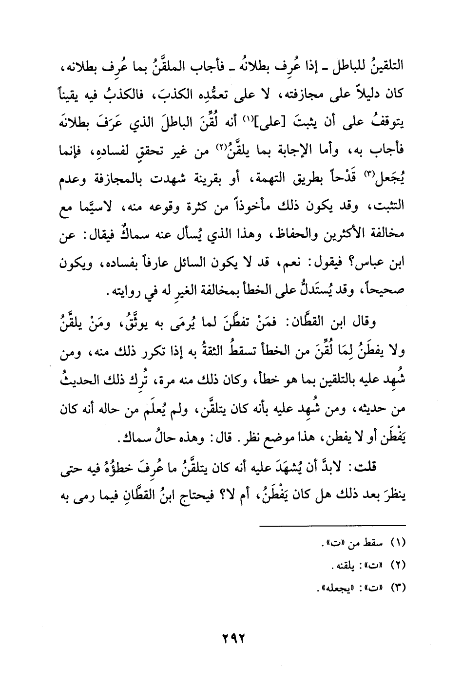 وقال ابن القطَّان: فمَنْ تفطَّنَ لما يُرمَى به يوثَّقُ، ومَنْ يلقَّنُ ولا يفطَنُ لِمَا لقِّنَ من الخطأ تسقطُ الثقةُ به إذا تكرر ذلك منه، ومن شُهِد عليه بالتلقين بما هو خطأ، وكان ذلك منه مرة، تُرِك ذلك الحديثُ من حديثه، ومن شُهِد عليه بأنه كان يتلقَّن، ولم يُعلَم من حاله أنه كان يَفْطَن أو لا يفطن، هذا موضع نظر. قال: وهذه حالُ سماك.
