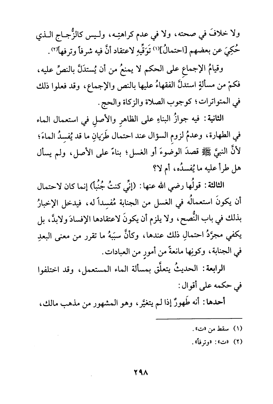 الرابعة: الحديثُ يتعلَّق بمسألة الماء المستعمل، وقد اختلفوا في حكمه على أقوال: