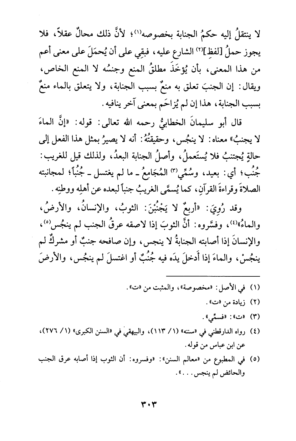 قال أبو سليمانَ الخطابيُّ رحمه الله تعالى: قوله: "إنَّ الماءَ لا يجنبُ" معناه: لا ينجُس، وحقيقتُهُ: أنه لا يصيرُ بمثل هذا الفعل إلى حالةٍ يُجتنبُ فلا يُستَعملُ، وأصلُ الجنابة البعدُ، ولذلك قيل للغريب: جُنُب؛ أي: بعيد، وسُمِّي (¬3) المُجَامعُ - ما لم يغتسل - جُنُباً؛ لمجانبته الصلاةَ وقراءةَ القرآنِ، كما يُسمَّى الغريبُ جنباً لبعده عن أهلِه ووطنِه.