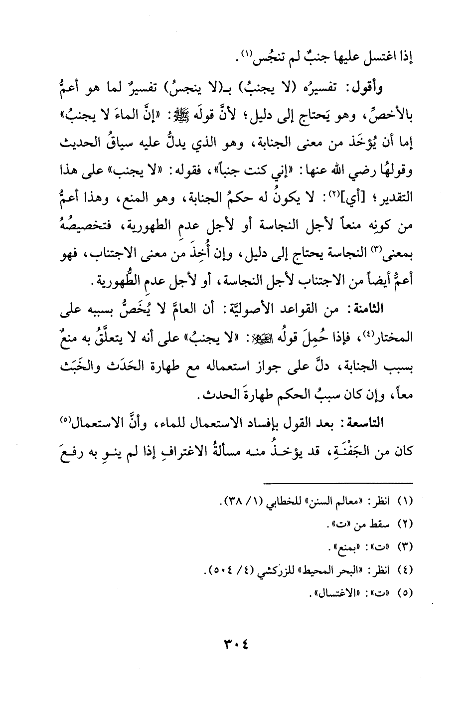 وأقول: تفسيرُه (لا يجنبُ) بـ (لا ينجسُ) تفسيرٌ لما هو أعمُّ بالأخصِّ، وهو يَحتاج إلى دليل؛ لأنَّ قولَه - صلى الله عليه وسلم -: "إنَّ الماءَ لا يجنبُ" إما أن يُؤخَذ من معنى الجنابة، وهو الذي يدلُّ عليه سياقُ الحديث وقولهُا رضي الله عنها: "إني كنت جنباً"، فقوله: "لا يجنب" على هذا التقدير؛ [أي] (¬2): لا يكونُ له حكمُ الجنابة، وهو المنع، وهذا أعمُّ من كونِه منعاً لأجل النجاسة أو لأجل عدمِ الطهورية، فتخصيصُهُ بمعنى (¬3) النجاسة يحتاج إلى دليل، وإن أُخِذَ من معنى الاجتناب، فهو أعمُّ أيضاً من الاجتناب لأجل النجاسة، أو لأجل عدمِ الطُّهورية.