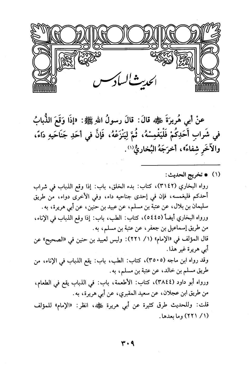 عنْ أبي هُريرَةَ - رضي الله عنه - قالَ: قالَ رسولُ اللهِ - صلى الله عليه وسلم -: "إذَا وَقَعَ الذُّبابُ في شَرابِ أَحَدِكُمْ فَلْيَغْمِسْهُ، ثُمَّ لِيَنْزَعْهُ، فَإنَّ في أحَدِ جَنَاحَيهِ دَاءً، والآخَرِ شِفاءً"، أخرَجَهُ البُخاريُّ (¬1).