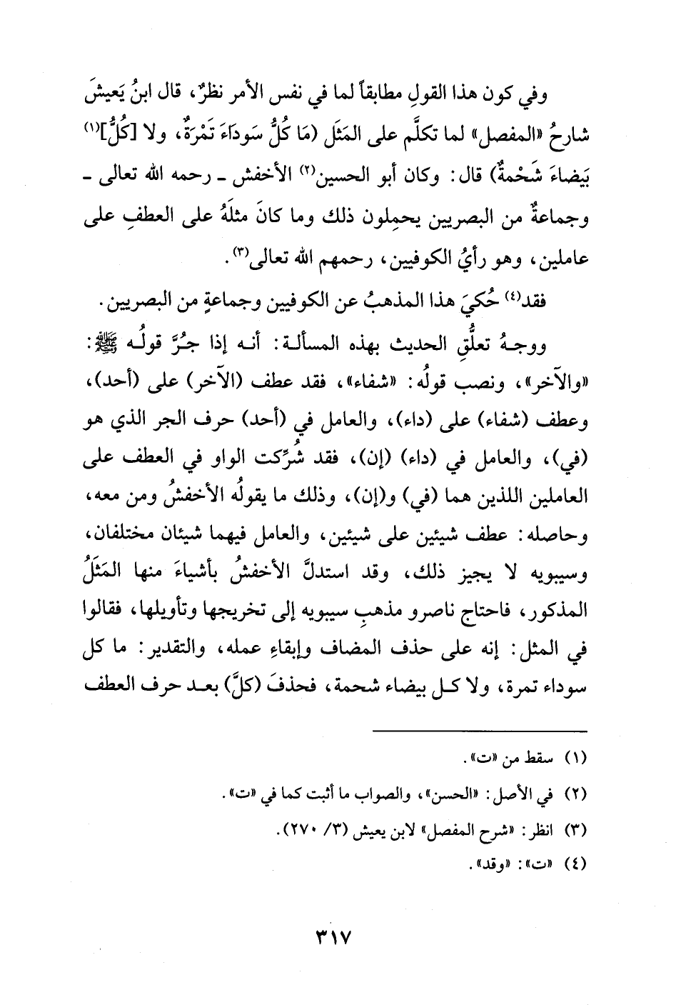 ووجهُ تعلُّقِ الحديث بهذه المسألة: أنه إذا جُرَّ قولُه - صلى الله عليه وسلم -: "والآخر"، ونصب قولُه: "شفاء"، فقد عطف (الآخر) على (أحد)، وعطف (شفاء) على (داء)، والعامل في (أحد) حرف الجر الذي هو (في)، والعامل في (داء) (إن)، فقد شُرِّكت الواو في العطف على العاملين اللذين هما (في) و (إن)، وذلك ما يقولُه الأخفشُ ومن معه، وحاصله: عطف شيئين على شيئين، والعامل فيهما شيئان مختلفان، وسيبويه لا يجيز ذلك، وقد استدلَّ الأخفشُ بأشياءَ منها المَثَلُ المذكور، فاحتاج ناصرو مذهبِ سيبويه إلى تخريجها وتأويلها، فقالوا في المثل: إنه على حذف المضاف وإبقاءِ عمله، والتقدير: ما كل سوداء تمرة، ولا كل بيضاء شحمة، فحذفَ (كلَّ) بعد حرف العطف