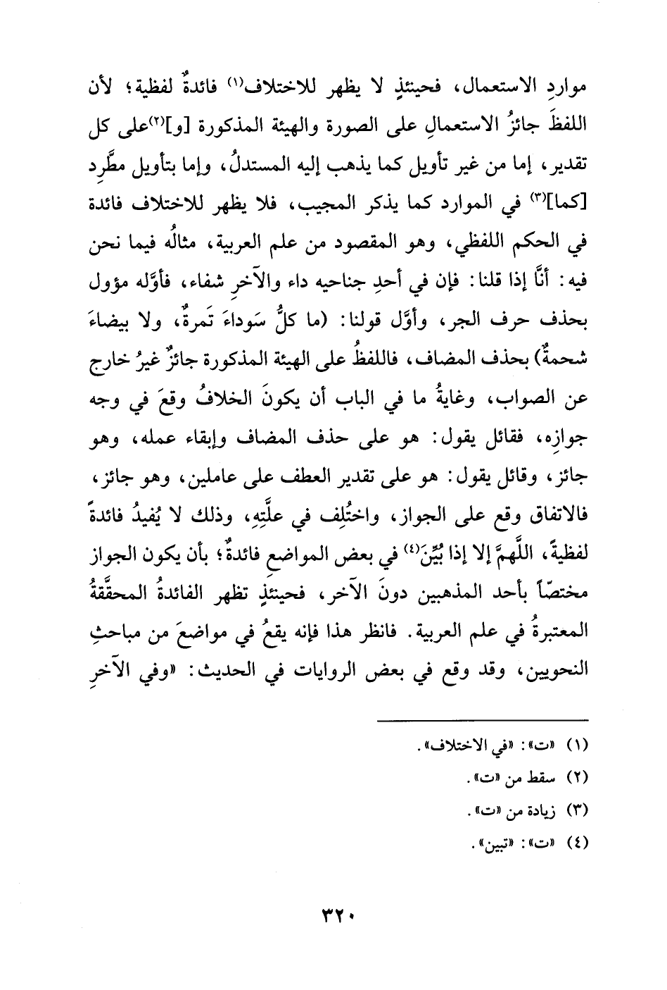 مواردِ الاستعمال، فحينئذٍ لا يظهر للاختلاف (¬1) فائدةٌ لفظية؛ لأن اللفظَ جائزُ الاستعمالِ على الصورة والهيئة المذكورة [و] (¬2) على كل تقدير، إما من غير تأويل كما يذهب إليه المستدلُ، وإما بتأويل مطَّرِد [كما] (¬3) في الموارد كما يذكر المجيب، فلا يظهر للاختلاف فائدة في الحكم اللفظي، وهو المقصود من علم العربية، مثالُه فيما نحن فيه: أنَّا إذا قلنا: فإن في أحدِ جناحيه داء والآخرِ شفاء، فأوَّله مؤول بحذف حرف الجر، وأوَّل قولنا: (ما كلُّ سَوداءَ تَمرةٌ، ولا بيضاءَ شحمةٌ) بحذف المضاف، فاللفظُ على الهيئة المذكورة جائزٌ غيرُ خارج عن الصواب، وغايةُ ما في الباب أن يكونَ الخلافُ وقعَ في وجه جوازِه، فقائل يقول: هو على حذف المضاف وإبقاء عمله، وهو جائز، وقائل يقول: هو على تقدير العطف على عاملين، وهو جائز، فالاتفاق وقع على الجواز، واختُلِف في علَّتِهِ، وذلك لا يُفيدُ فائدةً لفظيةً، اللَّهمَّ إلا إذا بُيِّنَ (¬4) في بعض المواضعِ فائدةٌ؛ بأن يكون الجواز مختصًّا بأحد المذهبين دونَ الآخر، فحينئذٍ تظهر الفائدةُ المحقَّقةُ المعتبرةُ في علم العربية. فانظر هذا فإنه يقعُ في مواضعَ من مباحثِ النحويين، وقد وقع في بعض الروايات في الحديث: "وفي الآخرِ