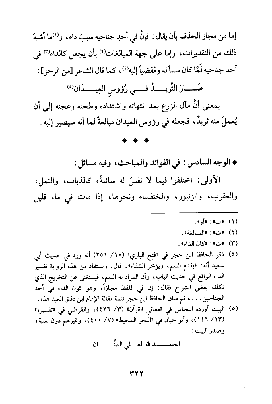 (¬4) ذكر الحافظ ابن حجر في "فتح الباري" (10/ 251) أنه ورد في حديث أبي سعيد أنه: "يقدم السم، ويؤخر الشفاء". قال: ويستفاد من هذه الرواية تفسير الداء الواقع في حديث الباب، وأن المراد به السم، فيستغنى عن التخريج الذي تكلفه بعض الشراح فقال: إن في اللفظ مجازاً، وهو كون الداء في أحد الجناحين ... ، ثم ساق الحافظ ابن حجر تتمة مقالة الإمام ابن دقيق العيد هذه.