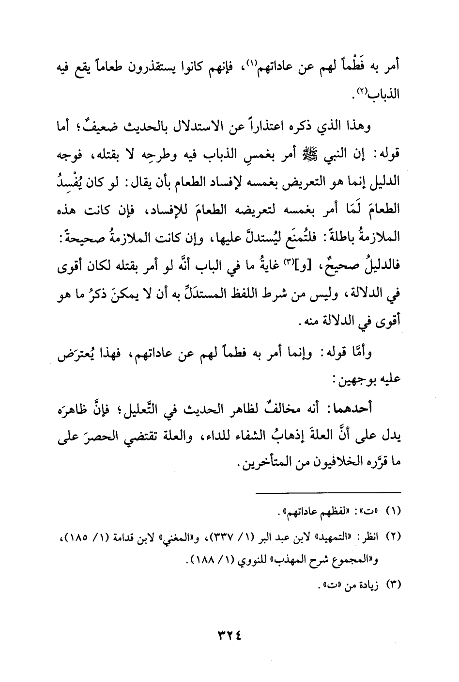 وهذا الذي ذكره اعتذاراً عن الاستدلال بالحديث ضعيفٌ؛ أما قوله: إن النبي - صلى الله عليه وسلم - أمر بغمسِ الذباب فيه وطرحِه لا بقتله، فوجه الدليل إنما هو التعريض بغمسه لإفساد الطعام بأن يقال: لو كان يُفْسِدُ الطعامَ لَمَا أمر بغمسه لتعريضه الطعامَ للإفساد، فإن كانت هذه الملازمةُ باطلةً: فلتُمنعَ ليُستدلَّ عليها، وإن كانت الملازمةُ صحيحةً: فالدليلُ صحيح، [و] (¬3) غايةُ ما في الباب أنَّه لو أمر بقتله لكان أقوى في الدلالة، وليس من شرط اللفظ المستدَلِّ به أن لا يمكنَ ذكرُ ما هو أقوى في الدلالة منه.