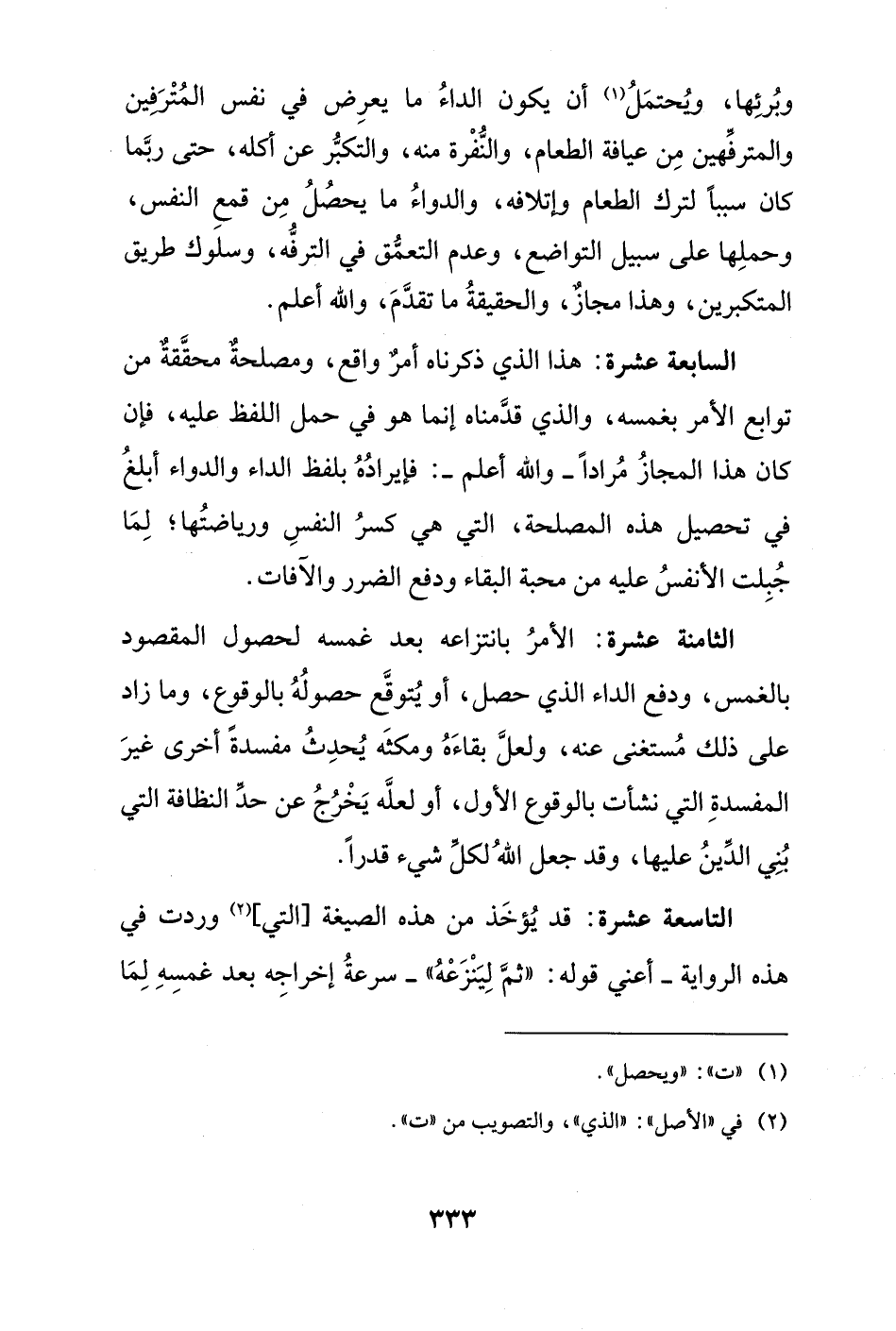 وبُرئِها، ويُحتمَلُ (¬1) أن يكون الداءُ ما يعرِض في نفس المُتْرَفِين والمترفِّهين مِن عيافة الطعام، والنُّفْرة منه، والتكبُّر عن أكله، حتى ربَّما كان سبباً لترك الطعام وإتلافه، والدواءُ ما يحصُلُ مِن قمعِ النفس، وحملِها على سبيل التواضع، وعدم التعمُّق في الترفُّه، وسلوك طريق المتكبرين، وهذا مجازٌ، والحقيقةُ ما تقدَّمَ، والله أعلم.