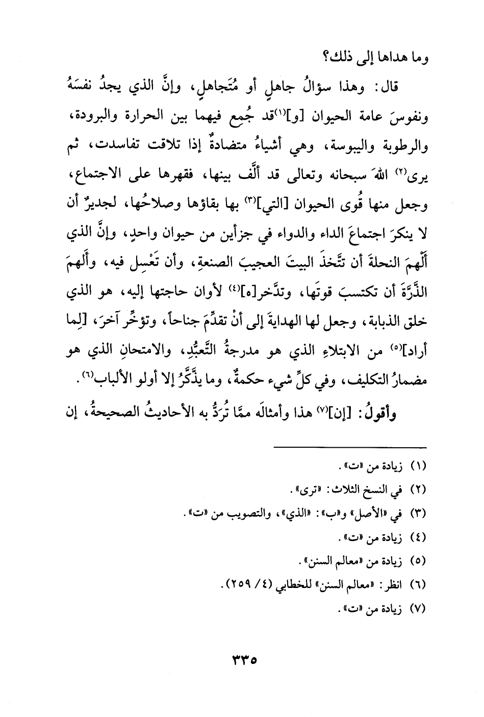 قال: وهذا سؤالُ جاهلِ أو مُتَجاهلٍ، وإنَّ الذي يجدُ نفسَهُ ونفوسَ عامة الحيوان [و] (¬1) قد جُمِع فيهما بين الحرارة والبرودة، والرطوبة واليبوسة، وهي أشياءُ متضادةٌ إذا تلاقت تفاسدت، ثم يرى (¬2) اللهَ سبحانه وتعالى قد ألَّف بينها، فقهرها على الاجتماع، وجعل منها قُوى الحيوان [التي] (¬3) بها بقاؤها وصلاحُها، لجديرٌ أن لا ينكرَ اجتماعَ الداء والدواء في جزأين من حيوان واحدٍ، وإنَّ الذي ألْهمَ النحلةَ أن تتَّخذَ البيتَ العجيبَ الصنعةِ، وأن تَعْسِل فيه، وأَلهمَ الذَّرَّةَ أن تكتسبَ قوتَها، وتدَّخر [5] (¬4) لأوان حاجتها إليه، هو الذي خلق الذبابة، وجعل لها الهدايةَ إلى أنْ تقدِّمَ جناحاً، وتؤخِّر آخرَ، [لِما أراد] (¬5) من الابتلاءِ الذي هو مدرجةُ التَّعبُّدِ، والامتحانِ الذي هو مضمارُ التكليف، وفي كلِّ شيء حكمةٌ، وما يذَّكَّرُ إلا أولو الألباب (¬6).