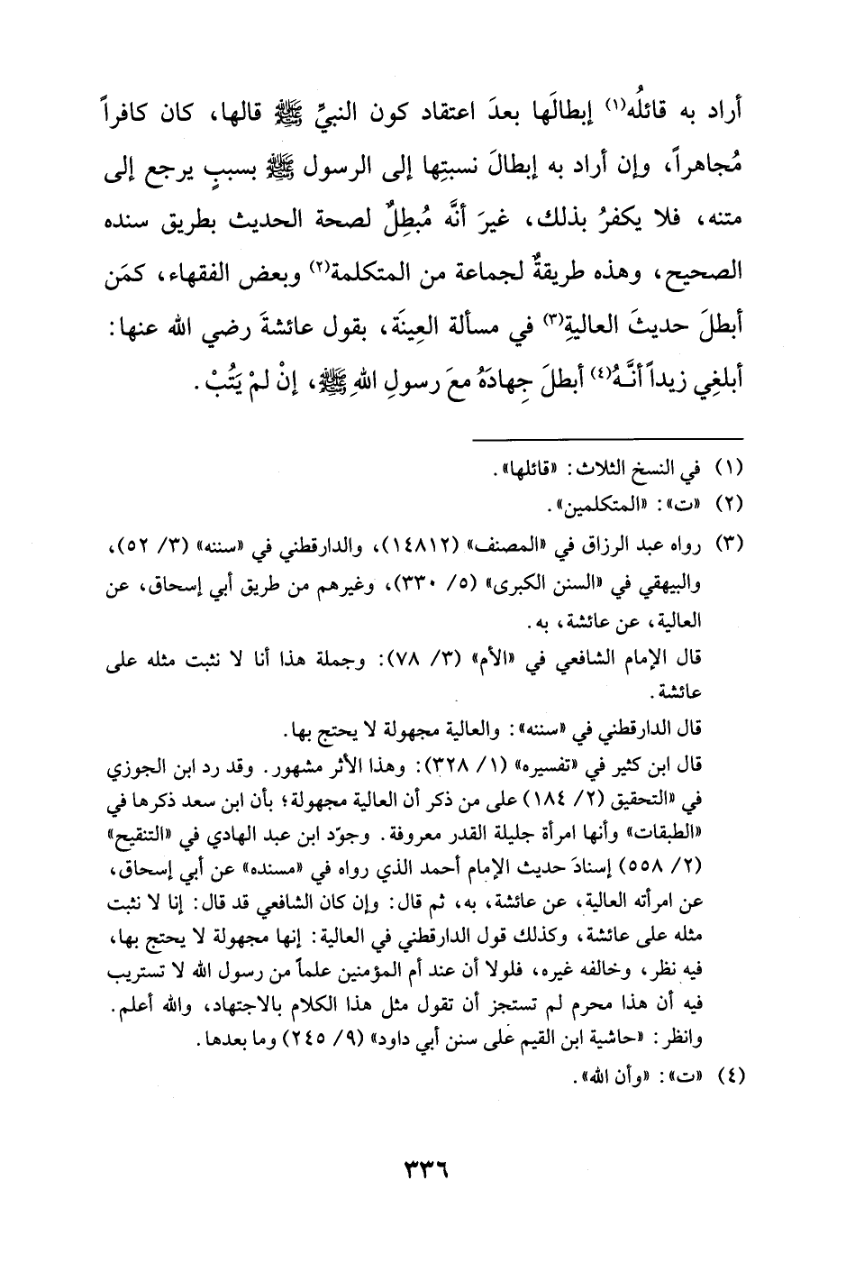 أراد به قائلُه (¬1) إبطالَها بعدَ اعتقاد كون النبيِّ - صلى الله عليه وسلم - قالها، كان كافراً مُجاهراً، وإن أراد به إبطالَ نسبتِها إلى الرسول - صلى الله عليه وسلم - بسببٍ يرجع إلى متنه، فلا يكفرُ بذلك، غيرَ أنَّه مُبطِلٌ لصحة الحديث بطريق سنده الصحيح، وهذه طريقةٌ لجماعة من المتكلمة (¬2) وبعض الفقهاء، كمَن أبطلَ حديثَ العاليةِ (¬3) في مسألة العِينَة، بقول عائشةَ رضي الله عنها: أبلغِي زيداً أنَّهُ (¬4) أبطلَ جِهادَهُ معَ رسولِ اللهِ - صلى الله عليه وسلم -، إنْ لمْ يَتُبْ.