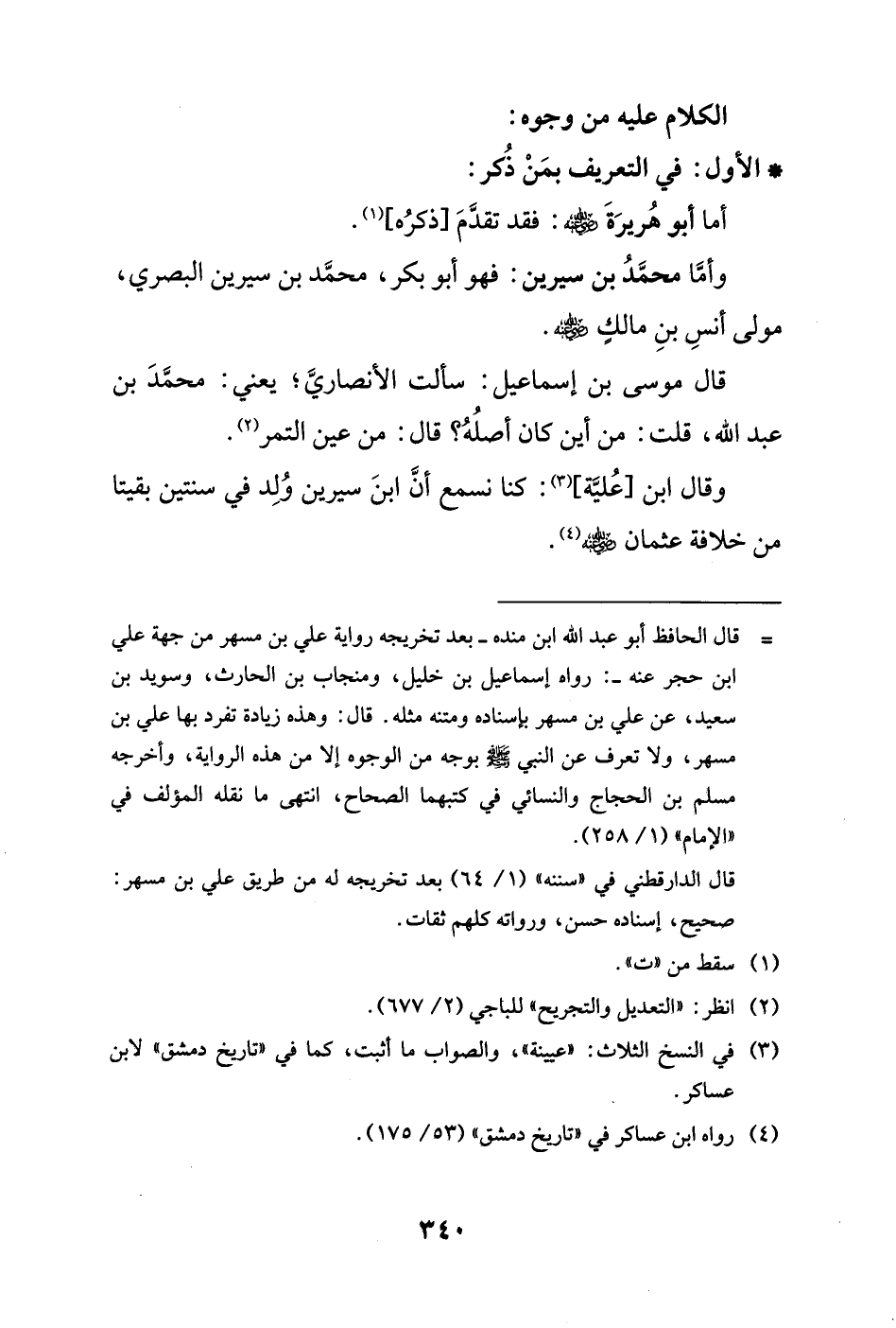 = قال الحافظ أبو عبد الله ابن منده - بعد تخريجه رواية علي بن مسهر من جهة علي ابن حجر عنه -: رواه إسماعيل بن خليل، ومنجاب بن الحارث، وسويد بن سعيد، عن علي ين مسهر بإسناده ومتنه مثله. قال: وهذه زيادة تفرد بها علي بن مسهر، ولا تعرف عن النبي - صلى الله عليه وسلم - بوجه من الوجوه إلا من هذه الرواية، وأخرجه مسلم بن الحجاج والنسائي في كتبهما الصحاح، انتهى ما نقله المؤلف في "الإمام" (1/ 258).