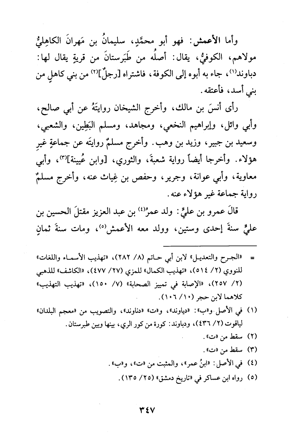 وأما الأعمش: فهو أبو محمَّدٍ، سليمانُ بن مَهرانَ الكاهِليّ مولاهم، الكوفيّ، يقال: أصلُه من طَبَرستانَ من قريةٍ يقال لها: دباوند (¬1)، جاء به أبوه إلى الكوفة، فاشتراه [رجل] (¬2) من بني كاهلٍ من بني أسد، فأعتقه.
