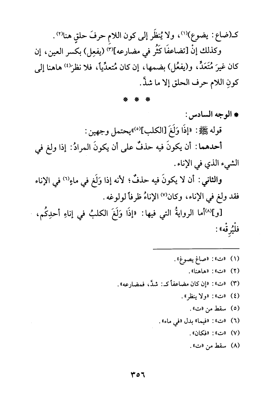 والثاني: أن لا يكونَ فيه حذفٌ، لأنه إذا وَلَغ في ماءٍ (¬6) في الإناء فقد ولغ في الإناء، وكان (¬7) الإناءُ ظرفا لولوغه.