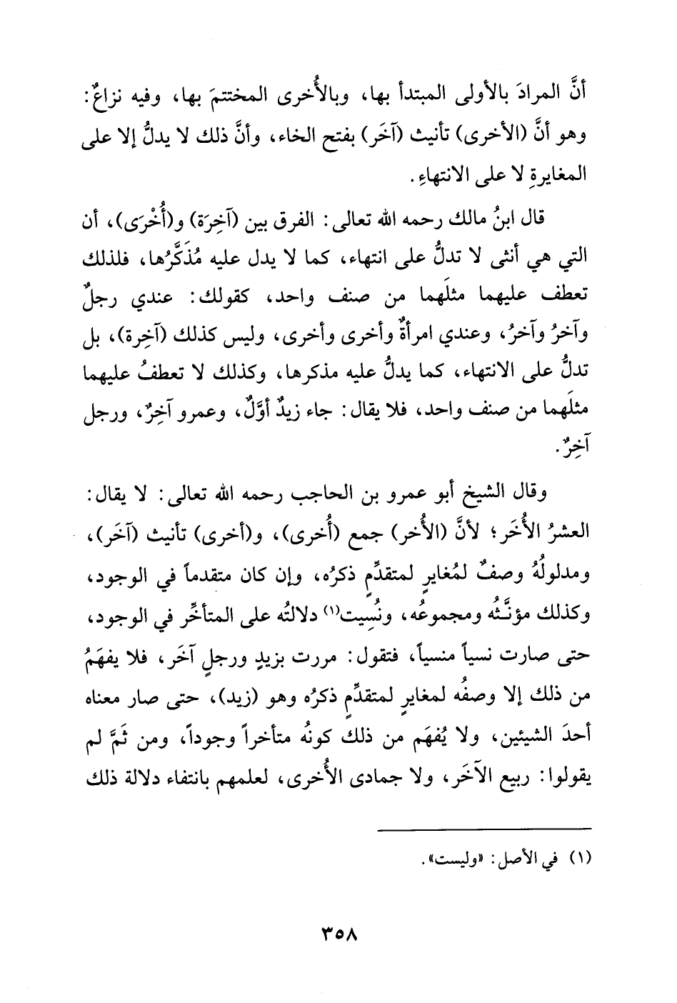 وقال الشيخ أبو عمرو بن الحاجب رحمه الله تعالى: لا يقال: العشرُ الأُخَر؛ لأنَّ (الأُخر) جمع (أُخرى)، و (أخرى) تأنيث (آخَر)، ومدلولُهُ وصفٌ لمُغايرٍ لمتقدّمٍ ذكرُه، وإن كان متقدماً في الوجود، وكذلك مؤنَّثُه ومجموعُه، ونُسيت (¬1) دلالتُه على المتأخِّر في الوجود، حتى صارت نسياً منسياً، فتقول: مررت بزيدِ ورجلٍ آخَر، فلا يفهَمُ من ذلك إلا وصفُه لمغايرٍ لمتقدِّمٍ ذكرُه وهو (زيد)، حتى صار معناه أحدَ الشيئين، ولا يُفهَم من ذلك كونُه متأخراً وجودًا، ومن ثَمَّ لم يقولوا: ربيع الآخَر، ولا جمادى الأُخرى، لعلمهم بانتفاء دلالة ذلك