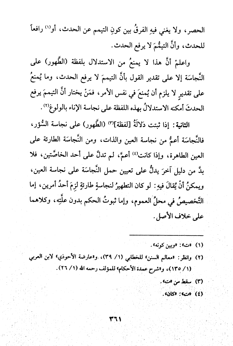 الثانية: إذا ثبتت دَلالَةُ [لفظة] (¬3) (الطَّهور) على نجاسهَ السُّؤر، فالنجاسَة أعمُّ من نجاسة العيق والذات، ومن النَّجاسَة الطارئة على العين الطاهرة، وإذا كانت (¬4) أعمَّ، لم تدل على أحد الخاصَّتين، فلا بدَّ من دليل آخر يدل على تعيين حمل النَّجاسَة على نجاسة العين، ويمكن أن يقالَ فيهِ: لو كان التطهيرُ لنجاسه طارئةٍ لزِمَ أحدُ أمرين، إما التخصيص في محلِّ العموم؛ وإما ثبوتُ الحكم بدون علتِه، وكلاهما على، خلاف الأصل.