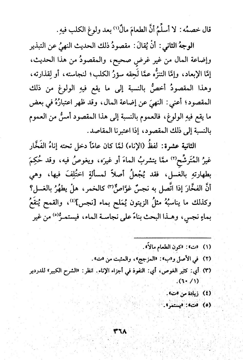الوجهُ الثاني: أن يقال: مقصود ذلك الحديث النهى عن التبذير وإضاعة المال من غير عوض صحيح، والمقصود من هذا الحديث، إما الإبعاد، وإما التنزه عما لحقه سؤر الكلب؛ لنجاسته أو لقذارته، وهذا المقصود أخص بالنسبة إلى ما يقع فيه الولوغ من ذلك المقصود؛ أعنى: النهى عن إضاعة المال، وقد ظهر اعتباره فى بعض ما يقع فيه الولوغ، فالعموم بالنسبة إلى هذا المقصود أمسُّ من العموم بالنسبة إلى ذلك إذا اعتبرنا المقاصد.