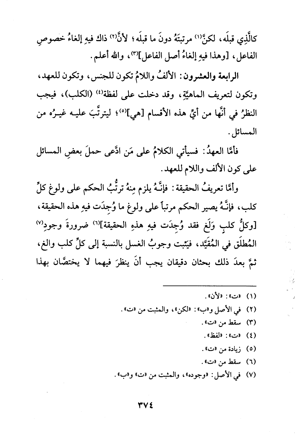 الرابعة والعشرون: الألفُ واللامُ تكون للجنس، وتكون للعهد، وتكون لتعريف الماهيَّةِ، وقد دخلت على لفظة (¬4) (الكلب)، فيجب النظرُ في أنَّها من أيِّ هذه الأقسام [هي] (¬5)؛ ليترتَّبَ عليه غيرُه من المسائل.