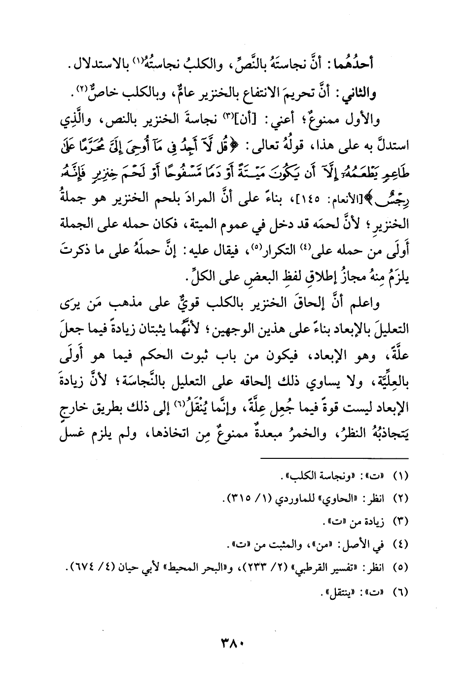 واعلم أنَ إلحاقَ الخنزير بالكلب قويٌّ على مذهب مَن يرَى التعليلَ بالإبعاد بناءً على هذين الوجهين؛ لأنَّهما يثبتان زيادةً فيما جعلَ علةً، وهو الإبعاد، فيكون من باب ثبوت الحكم فيما هو أَولَى بالعِلَيَّة، ولا يساوي ذلك إلحاقه على التعليل بالنَّجاسَة؛ لأنَّ زيادةَ الإبعاد ليست قوةً فيما جُعِل عِلَّةً، وإنَّما يُنْقَلُ (¬6) إلى ذلك بطريق خارجٍ تتجاذبُهُ النظرُ، والخمرُ مبعد ممنوعٌ مِن اتخاذها، ولم يلزم غسل