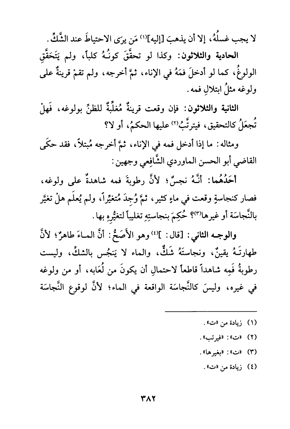 والوجه الثاني: [قال:] (¬4) وهو الأَصَحُّ: أنَّ الماءَ طاهرٌ؛ لأنَّ طهارتَهُ يقين، ونجاستَهُ شَكٌ، والماء لا يَنجُس بالشكِّ، وليست رطوبةُ فَمِه شاهداً قاطعا لاحتمالِ أن يكونَ من لُعَابه، أو من ولوغه في غيره، وليسَ كالنَّجاسَة الواقعة في الماء؛ لأنَّ لوقوع النَّجاسَة