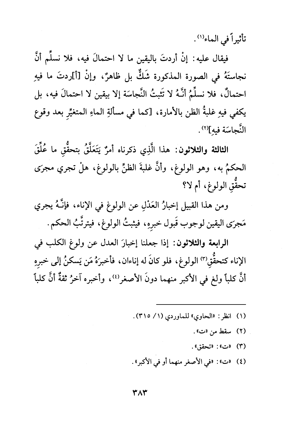 الثالثة والثلاثون: هذا الَّذِي ذكرناه أمرٌ يَتَعَلَّقُ بتحقُّقِ ما عُلِّقَ الحكمُ به، وهو الولوغ، وأنَّ غلبةَ الظنِّ بالولوغ، هلْ تجري مجرى تحقُّقِ الولوغ، أم لا؟