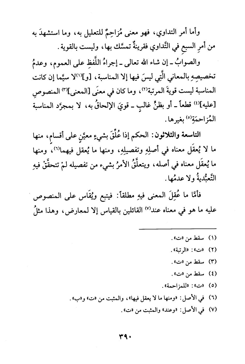 والصوابُ - إن شاء الله تعالى - إجراءُ اللَّفظِ على العموم، وعدمُ تخصيصِهِ بالمعاني الَّتِي ليسَ فيها إلا المناسبة، [و] (¬1) لا سيَّما إن كانت المناسبة ليست قويةَ المرتبة (¬2)، وما كان في معنَى [المعنى] (¬3) المنصوصِ [عليه] (¬4) قطعاً - أو بظن غالبٍ - قويَ الإلحاقُ به، لا بمجرَّد المناسبة المُزاحمَةِ (¬5) بغيرها.