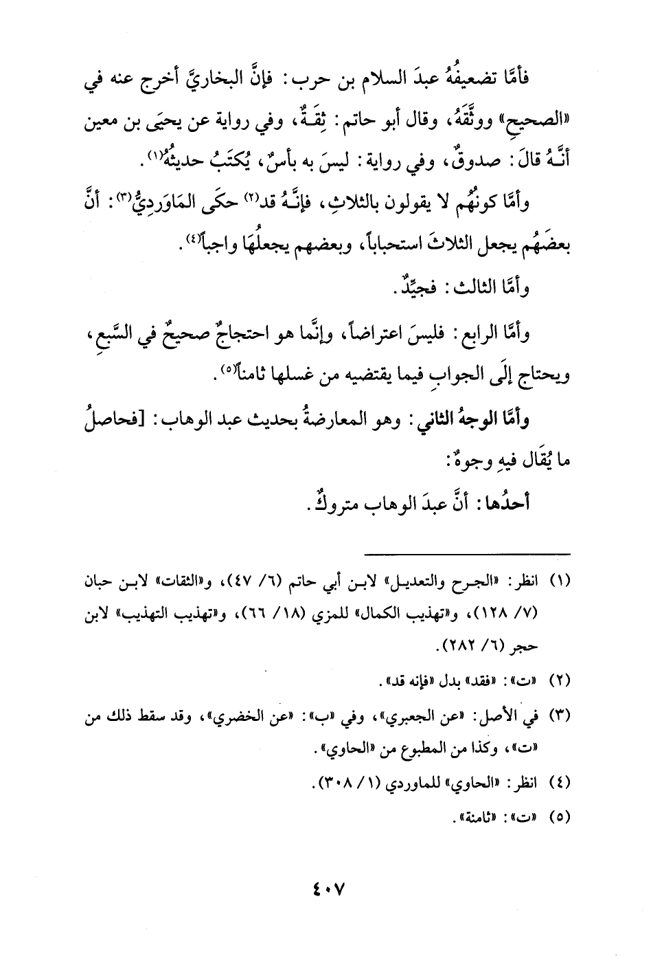 فأمَّا تضعيفُهُ عبدَ السلام بن حرب: فإنَّ البخاريَّ أخرج عنه في "الصحيحِ" ووثَّقَهُ، وقال أو حاتم: ثِقَةٌ، وفي رواية عن يحيىَ بن معين أنَّهُ قالَ: صدوقٌ، وفي رواية: ليسَ به بأسٌ، يُكتَبُ حديثُهُ (¬1).