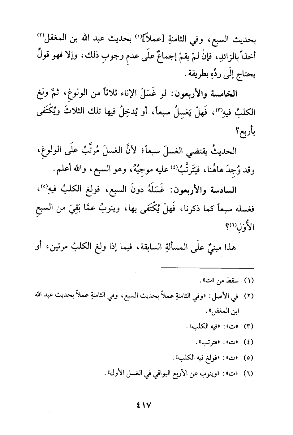بحديث السبع، وفي الثامنةِ [عملًا] (¬1) بحديث عبد الله بن المغفل (¬2) أخذًا بالزائدِ، فإنْ لمْ يقمْ إجماعٌ علَى عدمِ وجوبِ ذلك، وإلا فهو قولٌ يحتاج إلَى ردّهِ بطريقة.