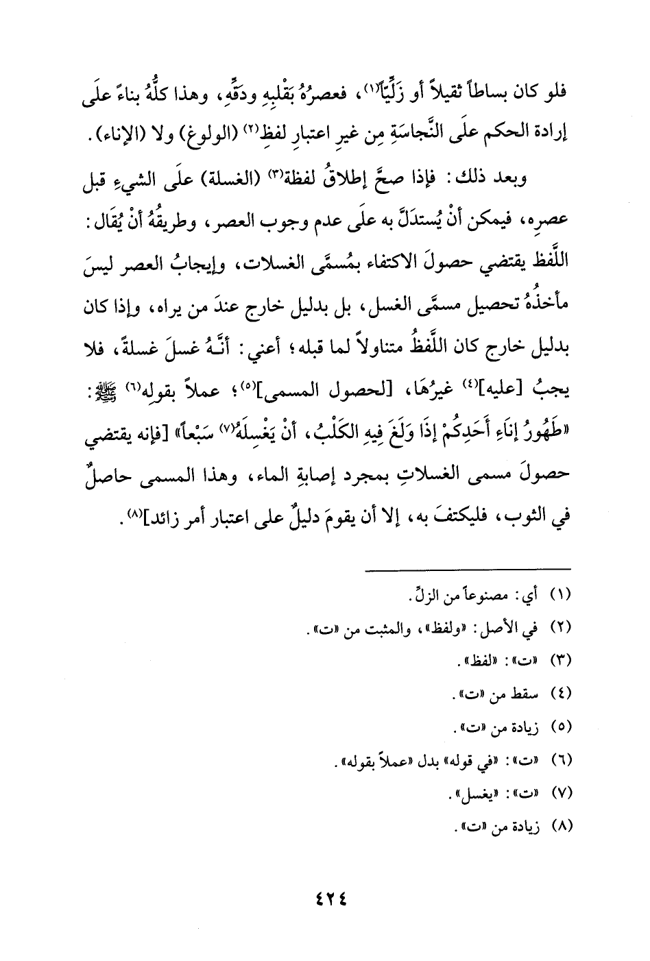 وبعد ذلك: فإذا صحَّ إطلاقُ لفظة (¬3) (الغسلة) علَى الشيءِ قبل عصرِه، فيمكن أنْ يُستدَلَّ به علَى عدم وجوب العصر، وطريقُهُ أنْ يُقَال: اللَّفظ يقتضي حصولَ الاكتفاء بمُسمَّى الغسلات، وإيجابُ العصر ليسَ مأخذُهُ تحصيل مسمَّى الغسل، بل بدليل خارج عندَ من يراه، وإذا كان بدليل خارج كان اللَّفظُ متناولًا لما قبله؛ أعني: أنَّهُ غسلَ غسلةً، فلا يجبُ [عليه] (¬4) غيرُهَا، [لحصول المسمى] (¬5) عملًا بقوله (¬6) - صلى الله عليه وسلم -: "طَهُورُ إنَاءِ أَحَدِكُمْ إذَا وَلَغَ فِيهِ الكَلْبُ، أنْ يَغْسِلَهُ (¬7) سَبْعًا" [فإنه يقتضي حصولَ مسمى الغسلاتِ بمجرد إصابةِ الماء، وهذا المسمى حاصلٌ في الثوب، فليكتفَ به، إلا أن يقومَ دليلٌ على اعتبار أمر زائد] (¬8).