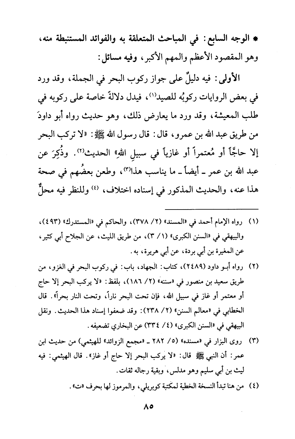 (¬3) روى البزار في "مسنده" (5/ 282 - "مجمع الزوائد" للهيثمي) من حديث ابن عمر: أن النَّبيُّ - صلى الله عليه وسلم - قال: "لا يركب البحر إلَّا حاج أو غاز". قال الهيثمي: فيه ليث بن أبي سليم وهو مدلس، وبقية رجاله ثقات.