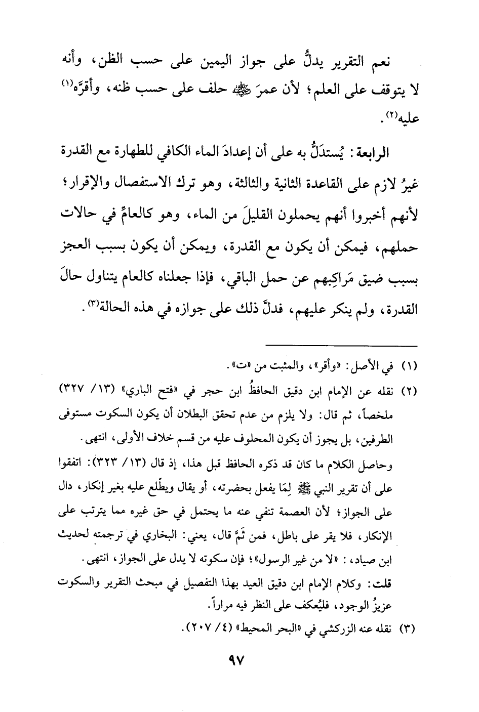 (¬2) نقله عن الإمام ابن دقيق الحافظُ ابن حجر في "فتح الباري " (13/ 327) ملخصًا، ثم قال: ولا يلزم من عدم تحقق البطلان أن يكون السكوت مستوفى الطرفين، بل يجوز أن يكون المحلوف عليه من قسم خلاف الأولى، انتهى.