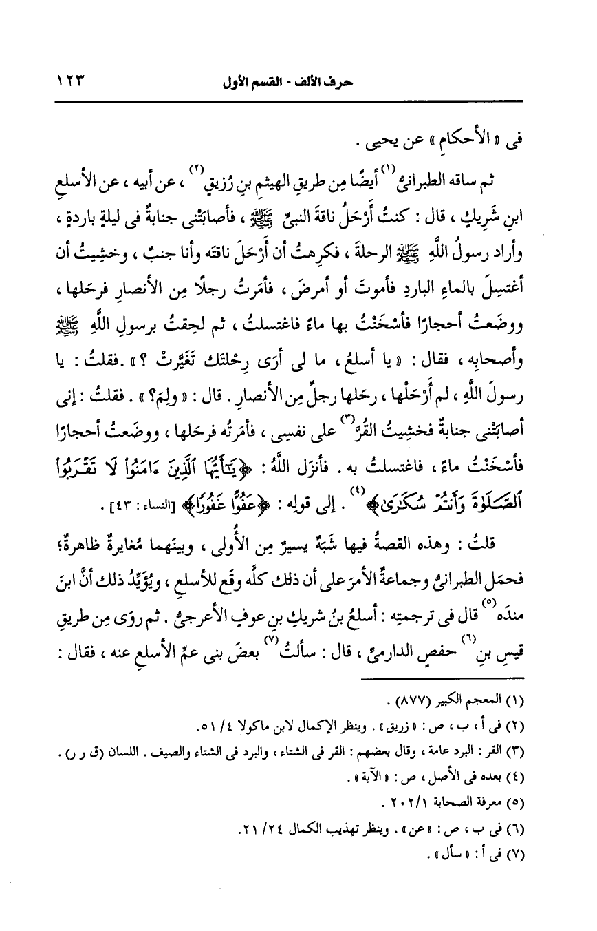 ثم ساقه الطبراني أيضًا من طريق الهيثم بن رزيق، عَن أَبيه، عَن الأسلع بن شريك قال كنت ارحل ناقة النَّبيّ صَلى الله عَلَيه وسَلم فأصابتني جنابة في ليلة باردة وأراد رسول الله صَلى الله عَلَيه وسَلم الرحلة فكرهت أن ارحل ناقته وأنا جنب وخشيت أن اغتسل بالماء البارد فأموت أو أمرض فأمرت رجلا من الأنصار فرحلها ووضعت أحجارا فأسخنت بها ماء فاغتسلت ثم لحقت رسول الله صَلى الله عَلَيه وسَلم وأصحابه فقال يا أسلع مالي أرى رحلتك تغيرت فقلت يا رسول الله لم ارحلها رحلها رجل من الأنصار قال ولم فقلت إني أصابتني جنابة فخشيت القر على نفسي فأمرته فرحلها ووضعت أحجارا فأسخنت ماء فاغتسلت به فأنزل الله {يا أيها الذين آمنوا لا تقربوا الصلاة وأنتم سكارى} إلى قوله {عفوا غفورا}.