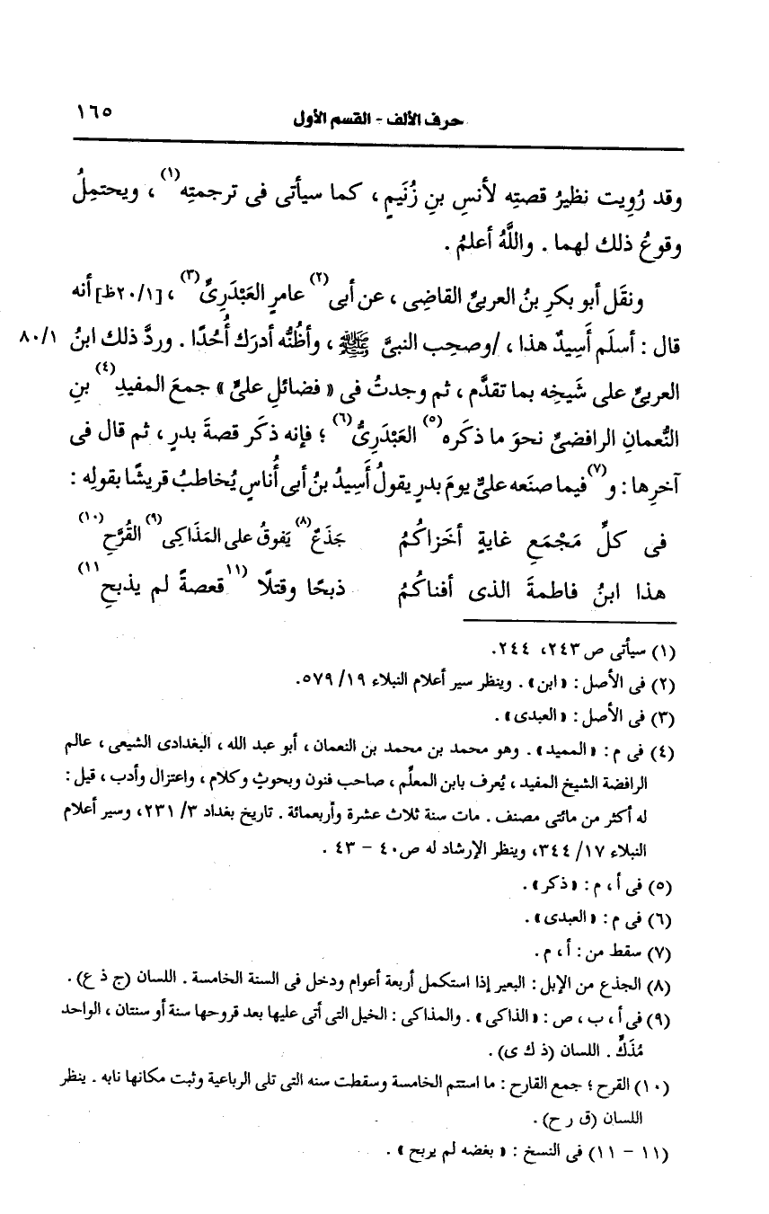 ونقل أَبو بكر بن العربي القاضي، عَن أبي عامر العبدري أنه قال أسلم أسيد هذا وصحب النَّبيّ صَلى الله عَلَيه وسَلم وأظنه أدرك أحدا ورد ذلك بن العربي على شيخه بما تقدم ثم وجدت في فضائل علي رضي الله عنه جمع المميد بن النعمان الرافضي نحو ما ذكر العبدي فإنه ذكر قصة بدر ثم قال في آخرها فيما صنعه رضي الله عنه يوم بدر يقول أسيد بن أبي أناس يخاطب قريشا بقوله: