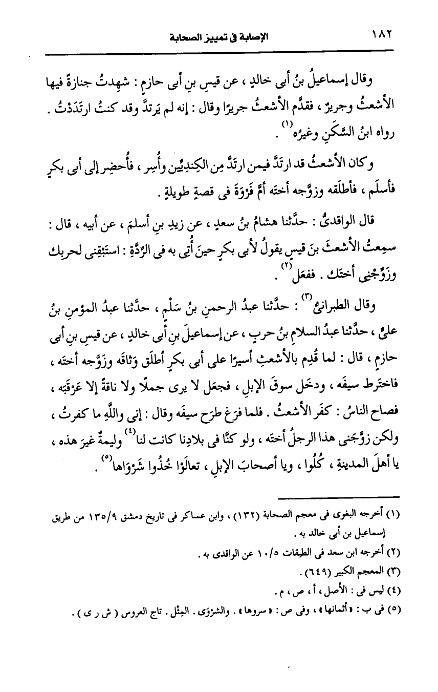 وقال الطَّبَرَانِيُّ: حَدَّثنا عبد الرحمن بن سلم، حَدَّثنا عبد المؤمن بن علي، قال: حَدَّثنا عبد السلام بن حرب، عَن إسماعيل بن أبي خالد، عَن قيس بن أبي حازم قال لما قدم بالأشعث أسيرا على أبي بكر أطلق وثاقه وزوجه أخته فاخترط سيفه ودخل سوق الإبل فجعل لا يرى جملا أو ناقة الا عرقبه فصاح الناس كفر الأشعث فلما فرغ طرح سيفه وقال إني والله ما كفرت ولكن زوجني هذا الرجل أخته ولو كنا في بلادنا كانت وليمة غير هذه يأهل المدينة كلوا ويا أصحاب الإبل تعالوا خذوا شرواها.