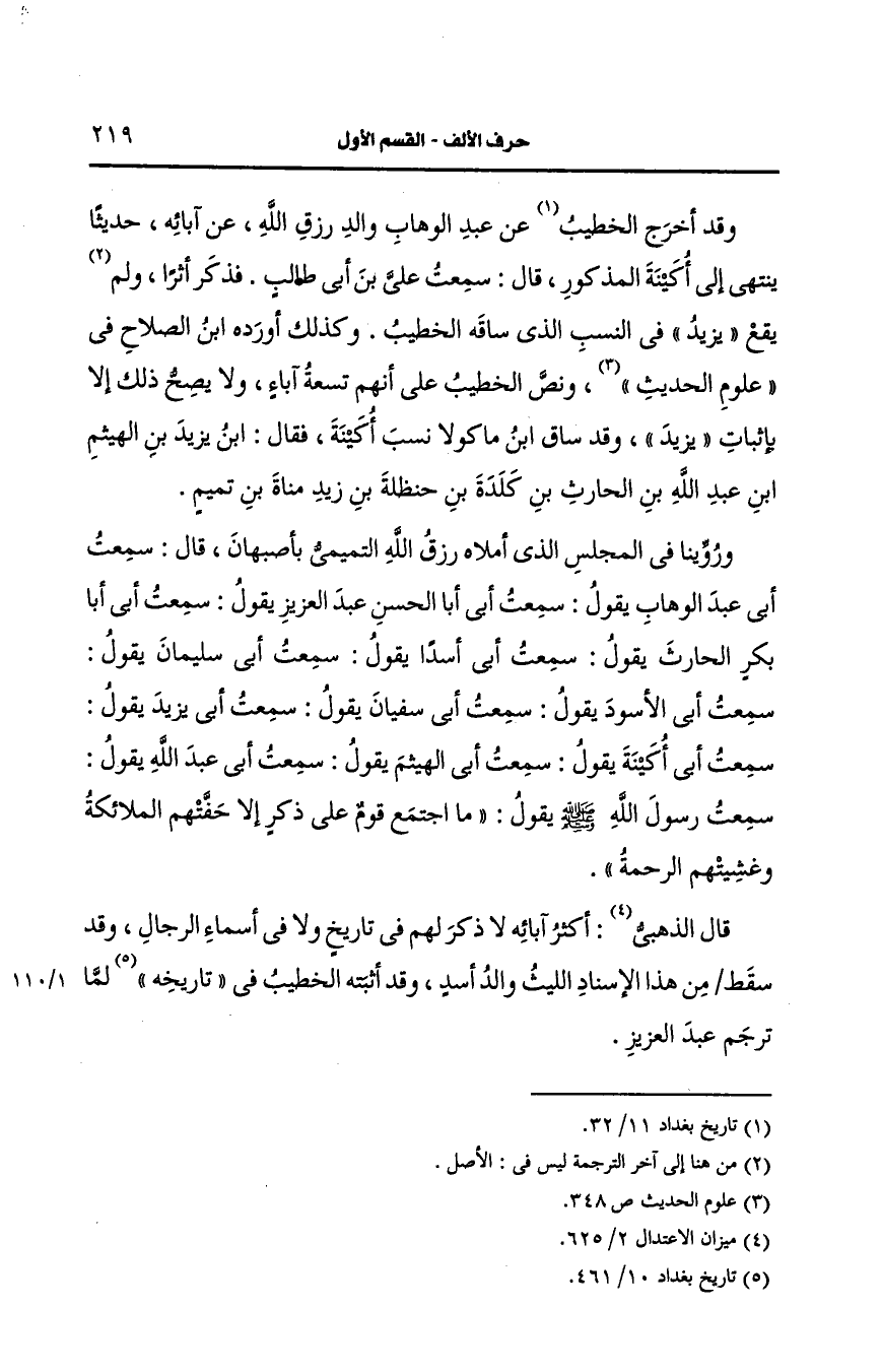ورويناه في المجلس الذي أملاه رزق الله التميمي بأصبهان قال سمعت أبي عبد الوهاب يقول سمعت أبي أبا الحسن عبد العزيز يقول سمعت أبي أبا بكر الحارث يقول سمعت أبي اسدا يقول سمعت أبي سليمان يقول سمعت أبي الأَسود يقول سمعت أبي سفيان يقول سمعت أبي يزيد يقول سمعت أبي اكينة يقول سمعت أبي الهيثم يقول سمعت أبي عَبد الله يقول سمعت رسول الله صَلى الله عَلَيه وسَلم يقول ما اجتمع قوم على ذكر الا حفتهم الملائكة وغشيتهم الرحمة.