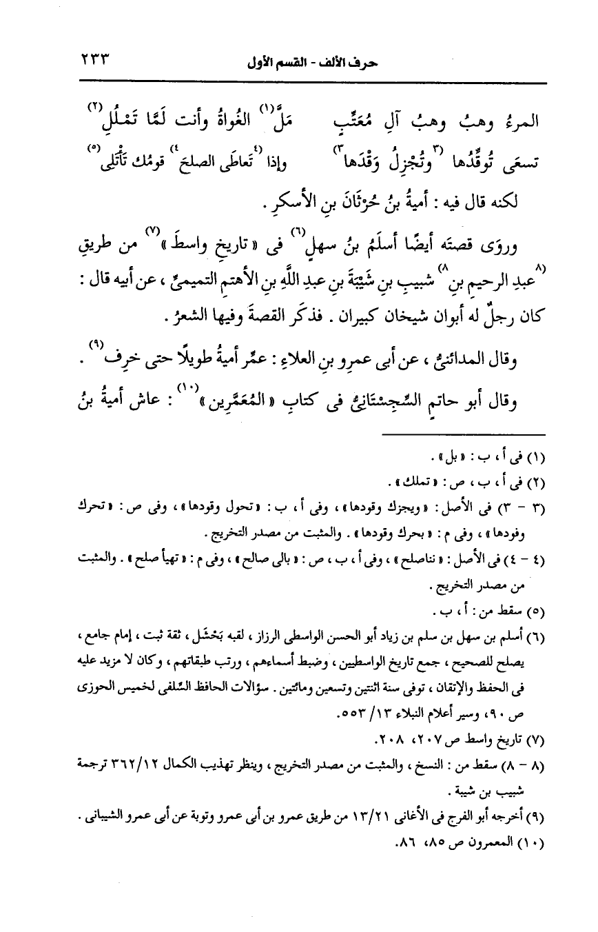 وقال أَبو حاتم السجستاني في كتاب المعمرين عاش أمية بن الاسكر دهرا طويلا وقال يتشوق إلى ابنه كلاب: