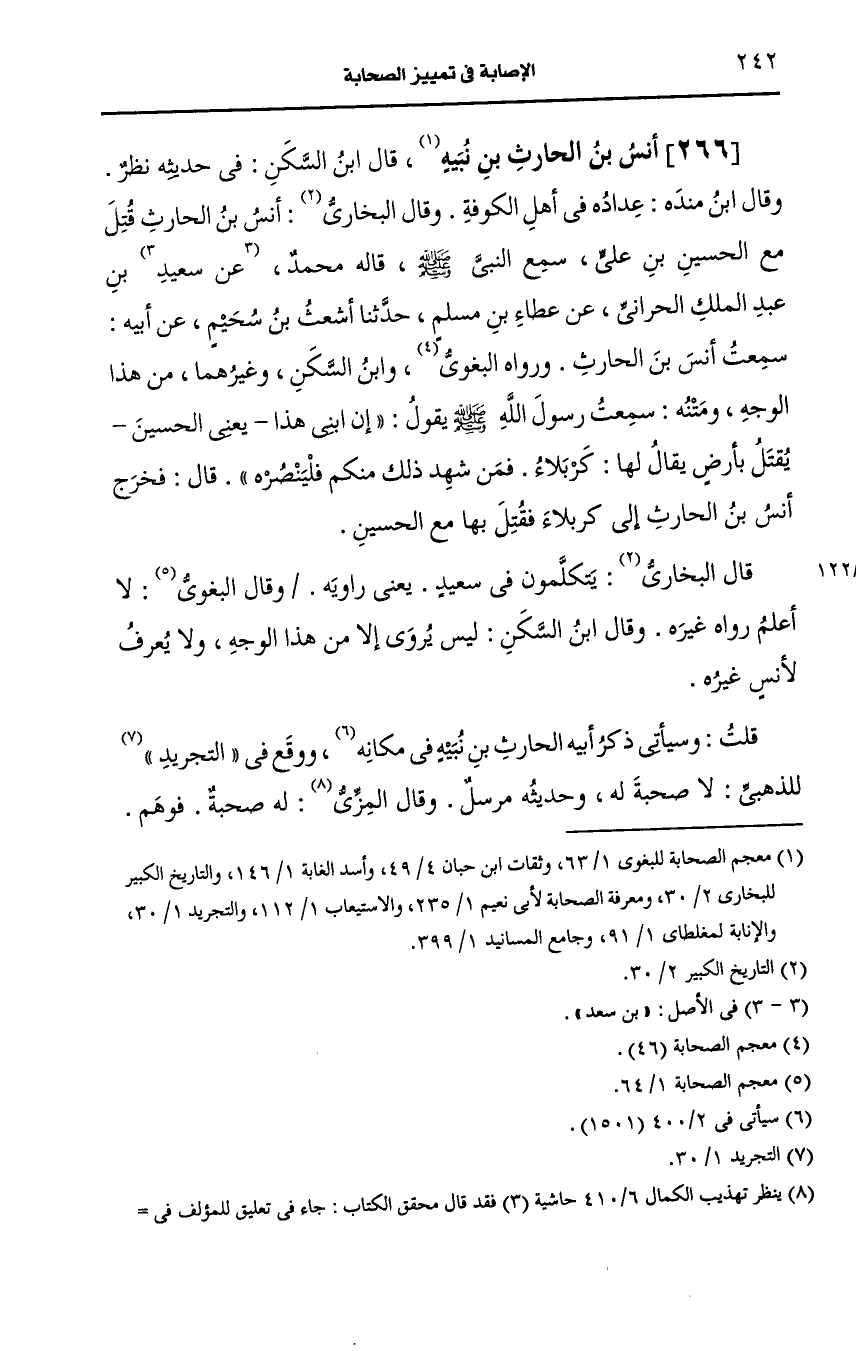 ورواه البَغَوِيُّ، وابن السَّكَن وغيرهما من هذا الوجه ومتنه سمعت رسول الله صَلى الله عَلَيه وسَلم يقول إن ابني هذا يعني الحسين يقتل بأرض يُقَالُ لَهَا: كربلاء فمن شهد ذلك منكم فلينصره قال فخرج أنس بن الحارث إلى كربلاء فقتل بها مع الحسين.