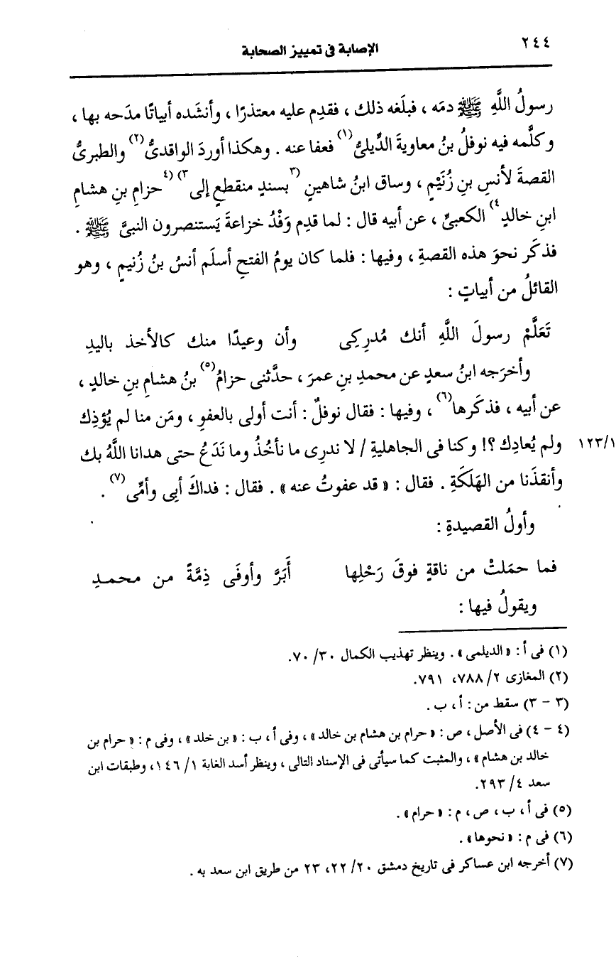 وأَخرجه ابن سَعد، عَن محمد بن عمر حدثني حرام بن هشام بن خالد، عَن أَبيه نحوها وفيها فقال نوفل أنت أولي بالعفو ومن منا لم يؤذك ولم يعادك وكنا في الجاهلية لا ندري ما نأخذ وما ندع حتى هدانا الله بك وانقذنا من الهلكة فقال قد عفوت عنه فقال فداك أبي وأمي.