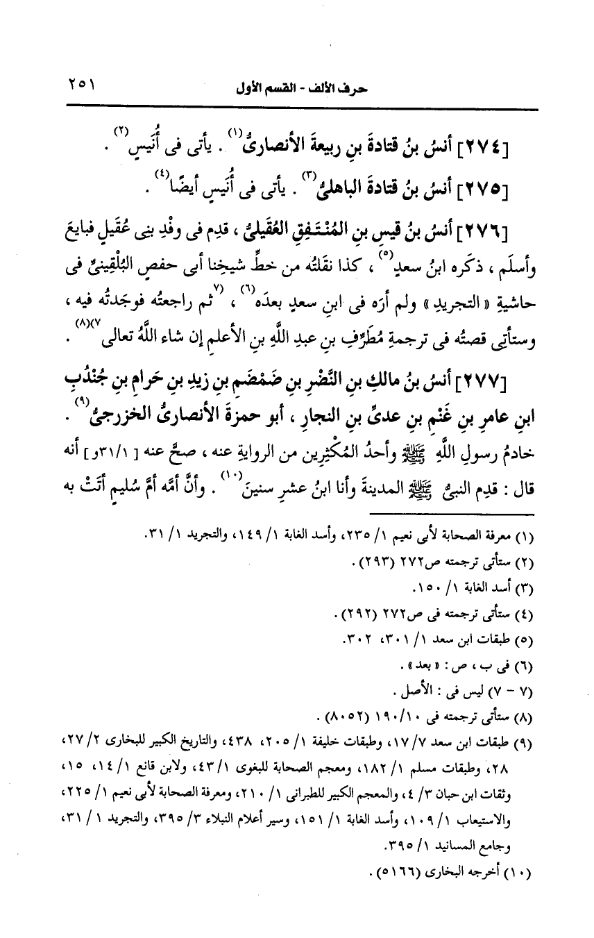 277- أنس بن مالك بن النضر بن ضمضم بن زيد بن حرام بن جُندَُب بن عامر بن غنم بن عَدِيّ بن النجار أَبو حمزة، الأَنصارِيّ الخزرجي.