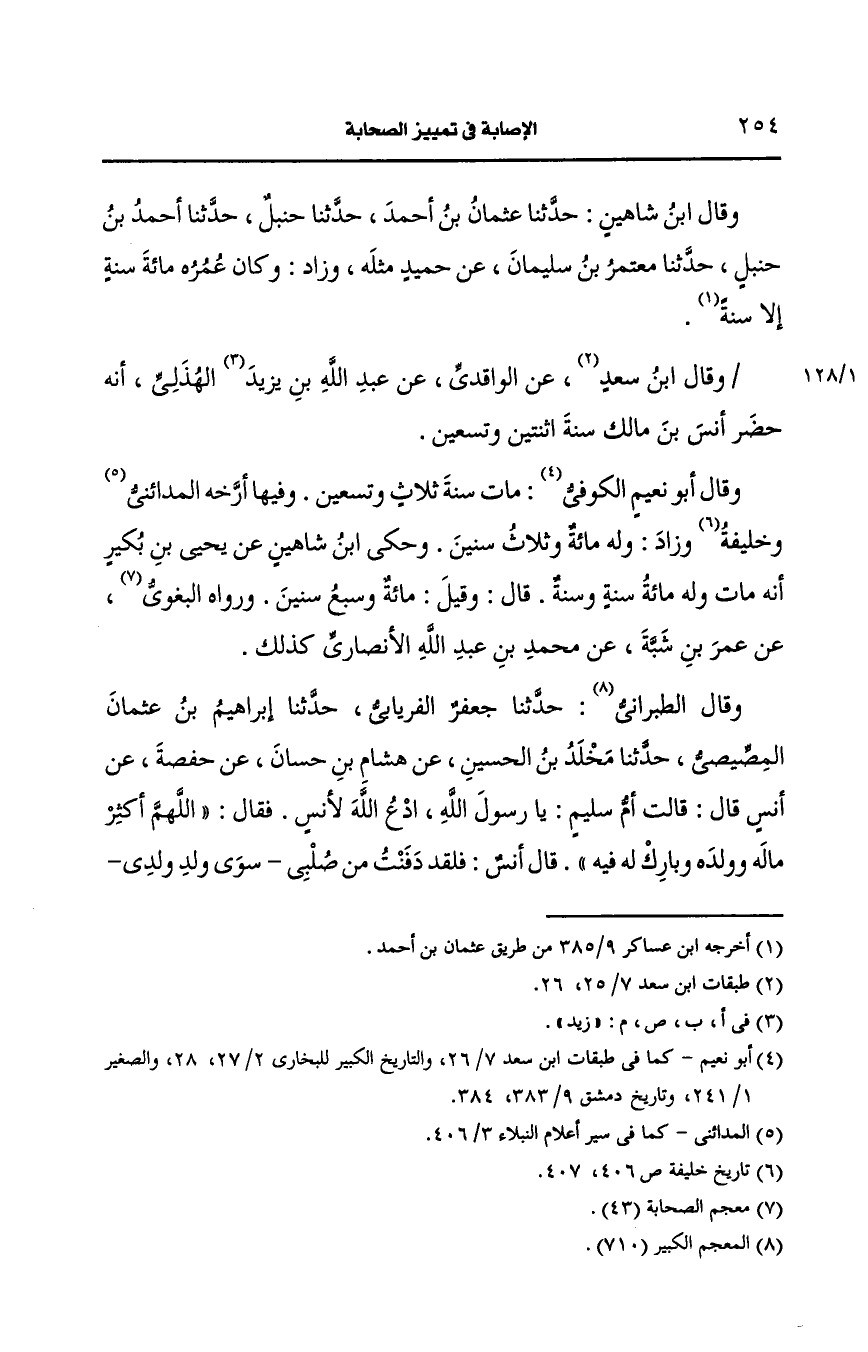 وقال ابن شاهين، حَدَّثنا عثمان بن أَحمد، حَدَّثنا حنبل، حَدَّثنا أَحمد بن حنبل، حَدَّثنا معتمر بن سليمان، عَن حميد مثله وزاد، وكان عمره مِئَة سنة إلا سنة.