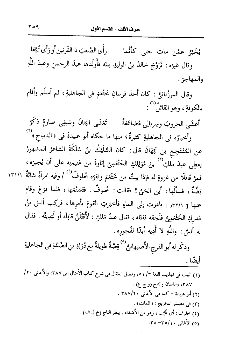 فإذا بيت من خثعم ونفره خلوف وفيه امرأة شابة بضة فسألها أين الحي فقالت خلوف فتسنمها فلما فرغ وقام عنها بادرت إلى الماء فأخبرت القوم بأمرها فركب أنس بن مدرك الخثعمي فلحقه فقتله فقال عبد الملك لاقتلن قاتله أو ليدينه فقال له أنس والله لااديه أبدا لفجوره.