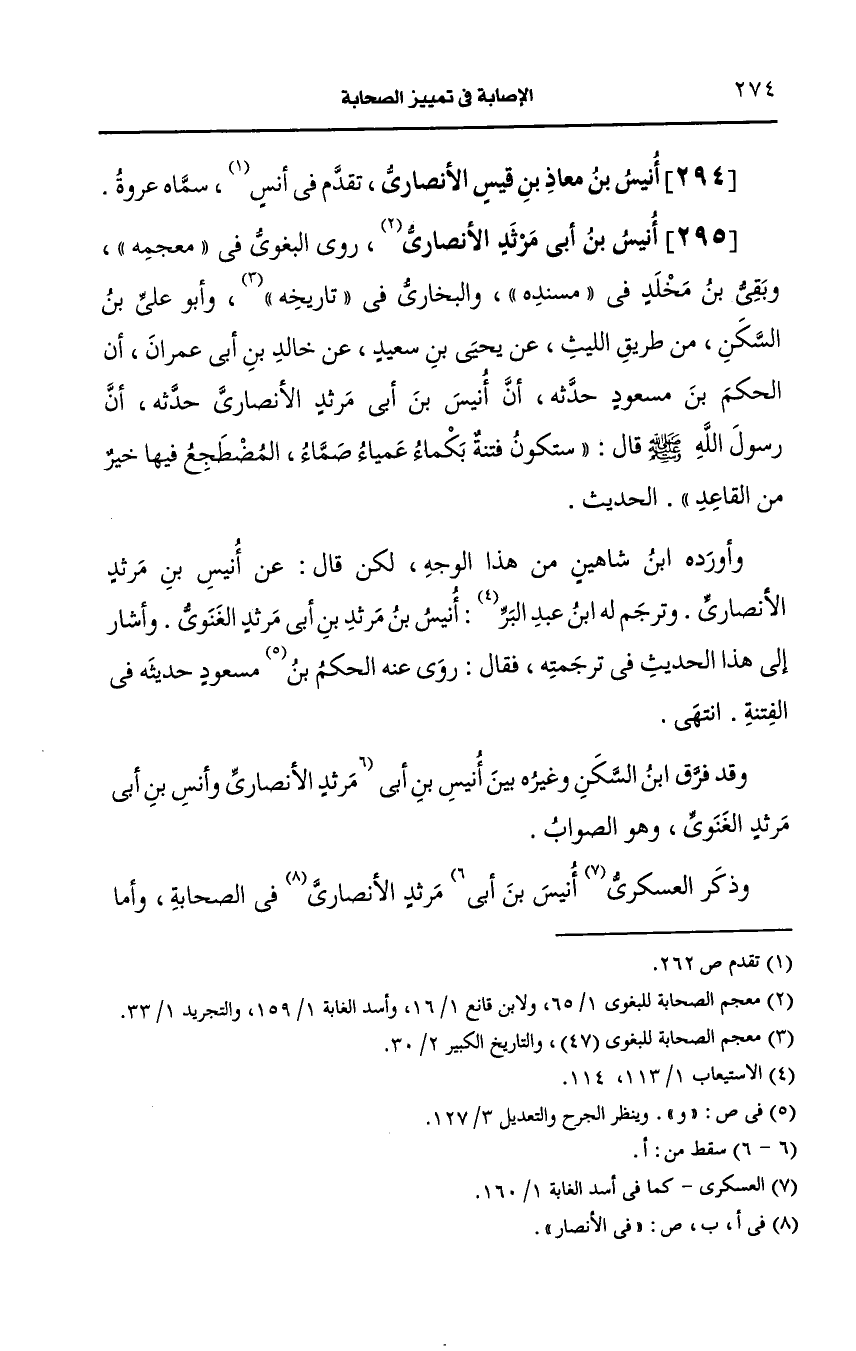 وأورده ابن شاهين من هذا الوجه لكن قال، عَن أنيس بن مرثد، الأَنصارِيّ وترجم له ابن عَبد البَرِّ أنيس بن مرثد بن أبي مرثد الغنوي وأشار إلى هذا الحديث في ترجمته فقال روى عنه الحكم بن مسعود حديثه في الفتنة انتهى.