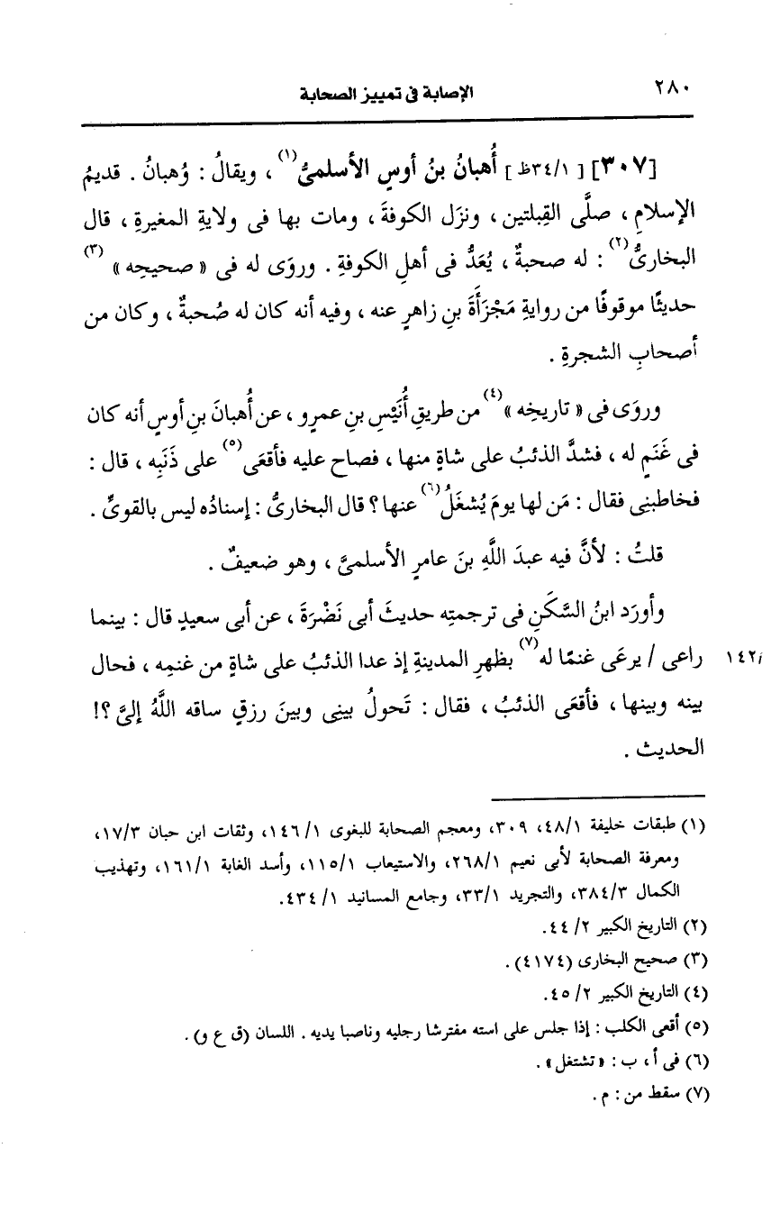 قال البُخَارِيُّ: له صُحبَةٌ يعد في أهل الكوفة وروى له، في "صحيحه" حديثا موقوفا من رواية مجزأة بن زاهر عنه وفيه أنه كان له صُحبَةٌ، وكان من أصحاب الشجرة وروى، في "تاريخه" من طريق أنيس بن عمرو، عَن أهبان بن أوس أنه كان في غنم له فشد الذئب على شاة منها فصاح عليه فأقعى على ذنبه قال فخاطبني، فقال: من لها يوم يشغل عنها.