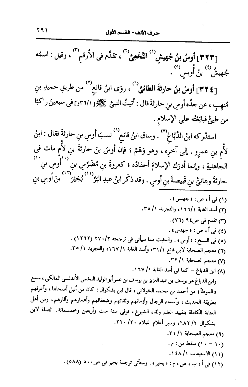 استدركه بن الدباغ وساق بن قانع نسب أوس بن حارثة فقال بن لام بن عَمرو إلى آخره وهو وهم فإن أوس بن حارثة بن لام مات في الجاهلية وإنما أدرك الإسلام احفاده كعُروَة بن مُضَرِّس بن حارثة وهانيء بن قبيصة بن أوس.