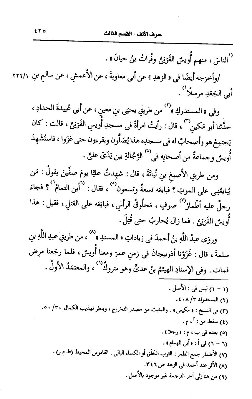وفي "المستدرك" من طريق يحيى بن مَعِين، عَن أبي عبيدة الحداد، حَدَّثنا أَبو مكيس، قال: رَأيتُ امرأة في مسجد أويس القرني قالت كان يجتمع هو وأصحاب له في مسجده هذا يصلون ويقرؤُون حتى غزوا فاستشهد أويس وجماعة من أصحابه الرجالة بين يدي علي.