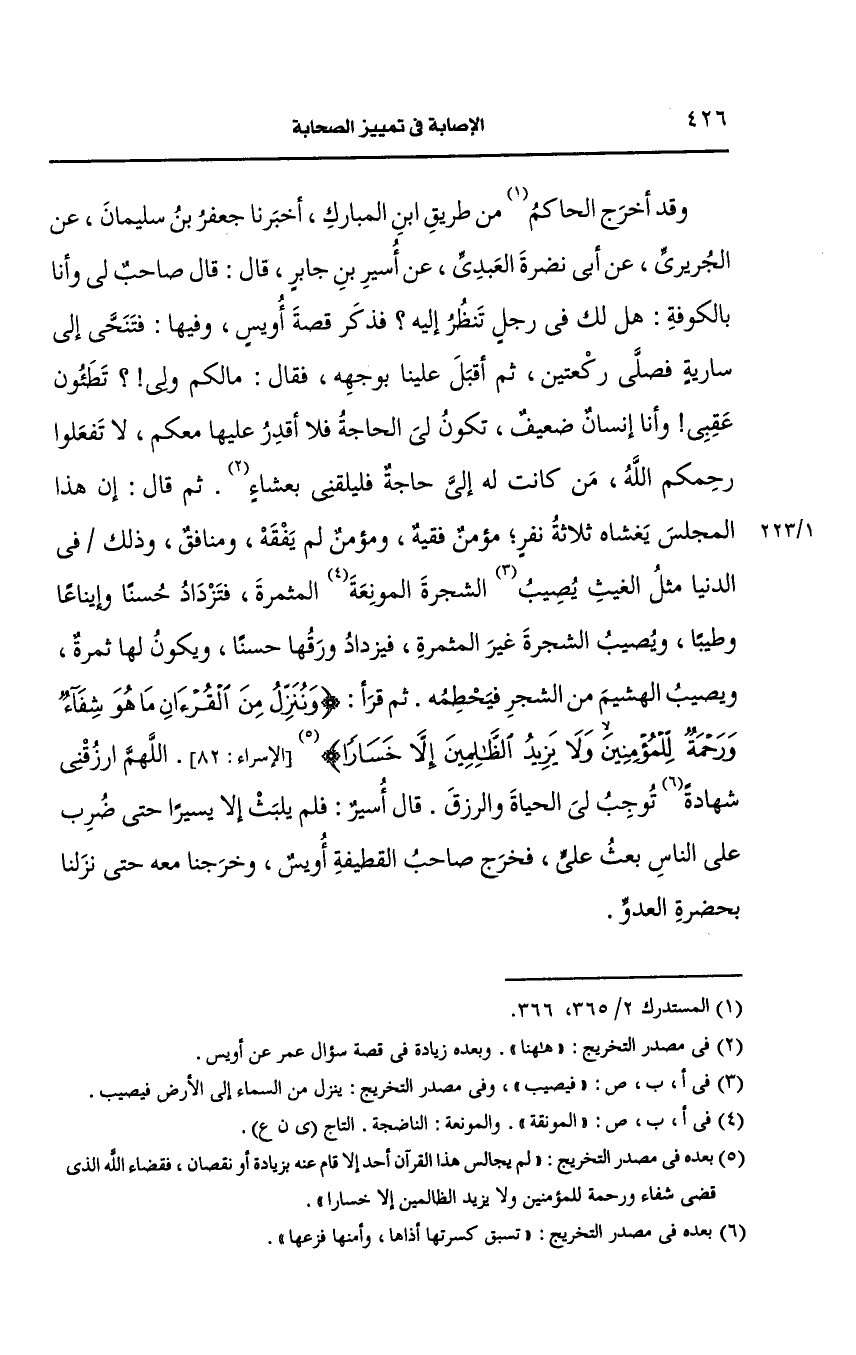 وقد أخرج الحاكم من طريق ابن المبارك أخبرنا جعفر بن سليمان، عَن الجريري، عَن أبي نضرة العبدي، عَن أسير بن جابر قال قال صاحب لي وأنا بالكوفة هل لك في رجل تنظر إليه فذكر قصة أويس وفيها فتنحى إلى سارية فصلى ركعتين ثم أقبل علينا بوجهه فقال مالكم ولي تطئون عقبي وأنا إنسان ضعيف تكون لي الحاجة فلا أقدر عليها معكم لا تفعلوا رحمكم الله من كانت له إلي حاجة فليلقني بعشاء ثم قال إن هذا المجلس يغشاه ثلاثة نفر مؤمن فقيه ومؤمن لا يفقه ومنافق وذلك في الدنيا مثل الغيث يصيب الشجرة المونعة المثمرة فتزداد حسنا وايناعا وطيبا ويصيب الشجرة غير المثمرة فيزداد ورقها حسنا ويكون لها ثمرة ويصيب الهشيم من الشجرة فيحطمه ثم قرأ {وننزل من القرآن ما هو شفاء ورحمة للمؤمنين ولا يزيد الظالمين إلا خسارا} اللهم ارزقني شهادة توجب لي الحياة والرزق قال أسير فلم يلبث الا يسيرا ضرب على الناس بعث علي فخرج صاحب القطيفة أويس وخرجنا معه حتى نزلنا بحضرة العدو.