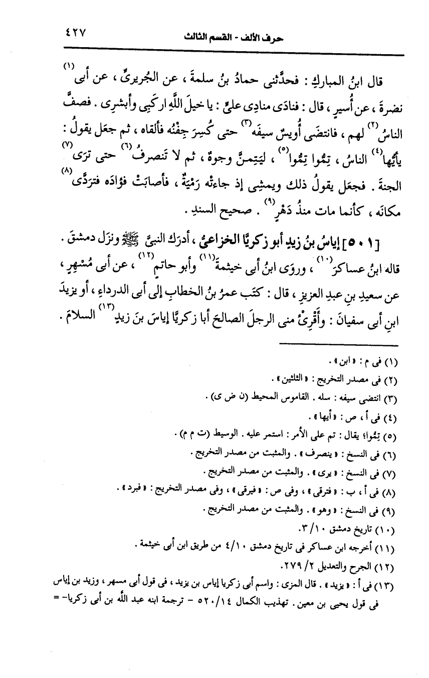 وروى ابن أَبِي خَيْثَمَةَ، وأَبو حاتم، عَن أبي مسهر، عَن سعيد بن عبد العزيز قال كتب عمر بن الخطاب إلى أبي الدرداء أو يزيد بن أبي سفيان واقرىء مني الرجل الصالح أبا زكريا إياس بن زيد السلام ولأبي زكريا رواية، عَن سلمان الفارسي وغيره.