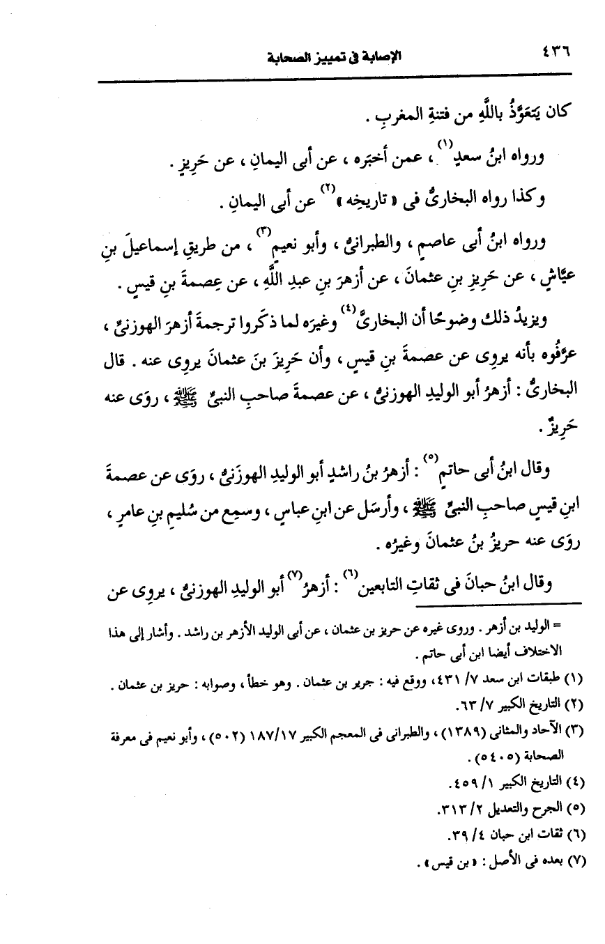 وقال ابنُ أَبِي حاتم: أزهر بن راشد أَبو الوليد الهوزني روى، عَن عصمة بن قيس صاحب النَّبيّ صَلى الله عَلَيه وسَلم وأرسل، عَن ابن عباس وسمع من سليم بن عامر روى عنه حريز بن عثمان وغيره.