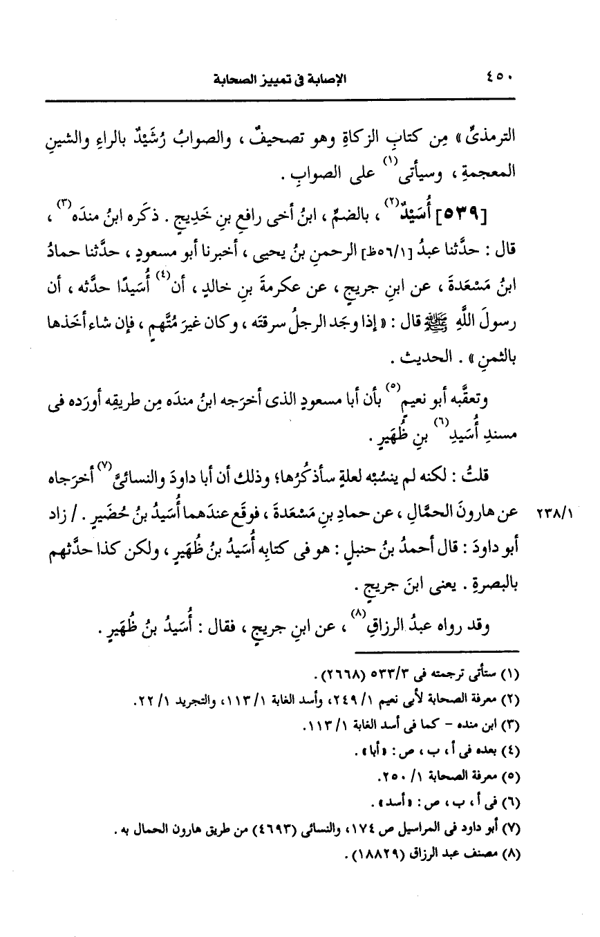 وتعقبه أَبو نعيم بان أبا مسعود الذي أَخرجه ابن مَنْدَه من طريقه أورده في مسند أُسَيد بن ظُهَير. قلت: لكنه لم ينسبه لعلة سأذكرها وذلك أن أبا داود والنسائي أخرجاه، عَن هارون الحمال، عَن حماد بن مسعدة فوقع عندهما أسيد بن خضير.