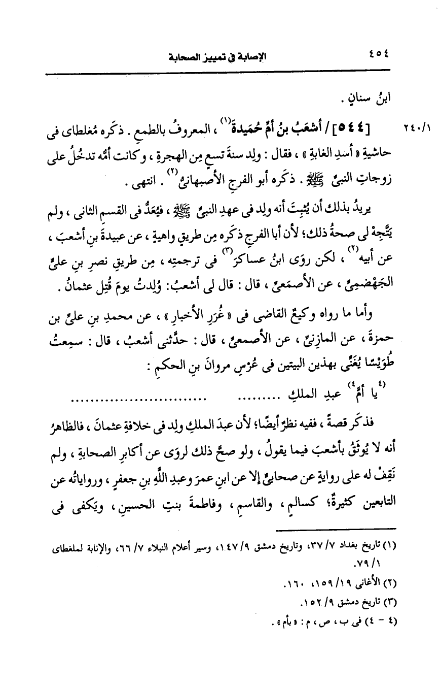 ولم يتجه لي صحة ذلك لأن أبي أبا الفرج ذكره من طريق واهية، عَن عبيده بن أشعب، عَن أَبيه لكن رَوى ابن عساكر في ترجمته من طريق نصر بن علي الجهضمي، عَن الأصمعي قال قال لي أشعب ولدت يوم قتل عثمان.