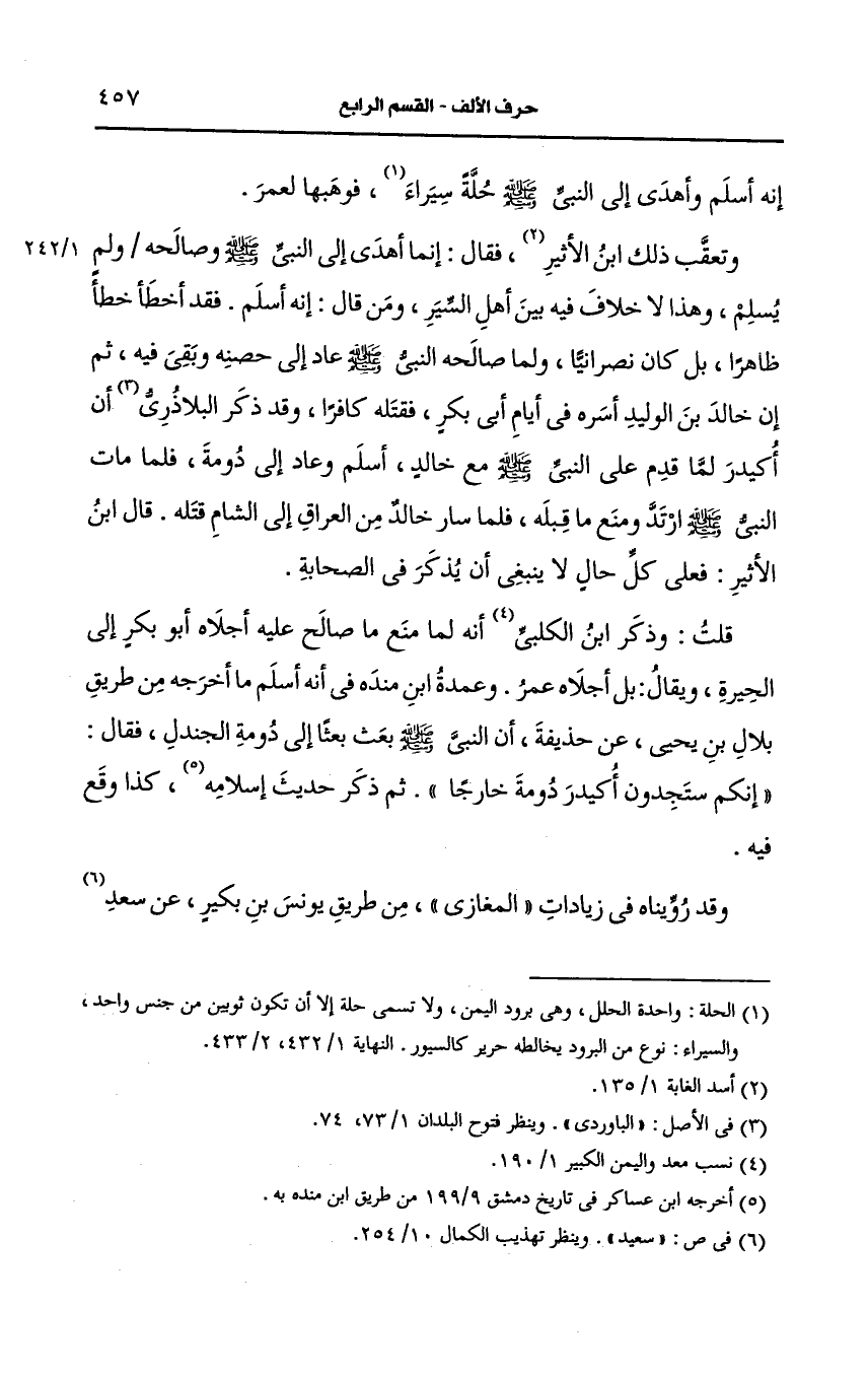 وتعقب ذلك ابن الأَثِير فقال إنما أهدى إِلَى النَّبِيِّ صَلى الله عَلَيه وسَلم وصالحه ولم يسلم وهذا لا خلاف فيه بين أهل السير ومن قال إنه أسلم فقد أخطأ خطأ ظاهرا بل كان نصرانيا ولما صالحه النَّبيّ صَلى الله عَلَيه وسَلم عاد إلى حصنة وبقي فيه ثم إن خالد بن الوليد أسره في أيام أبي بكر فقتله كافرا.