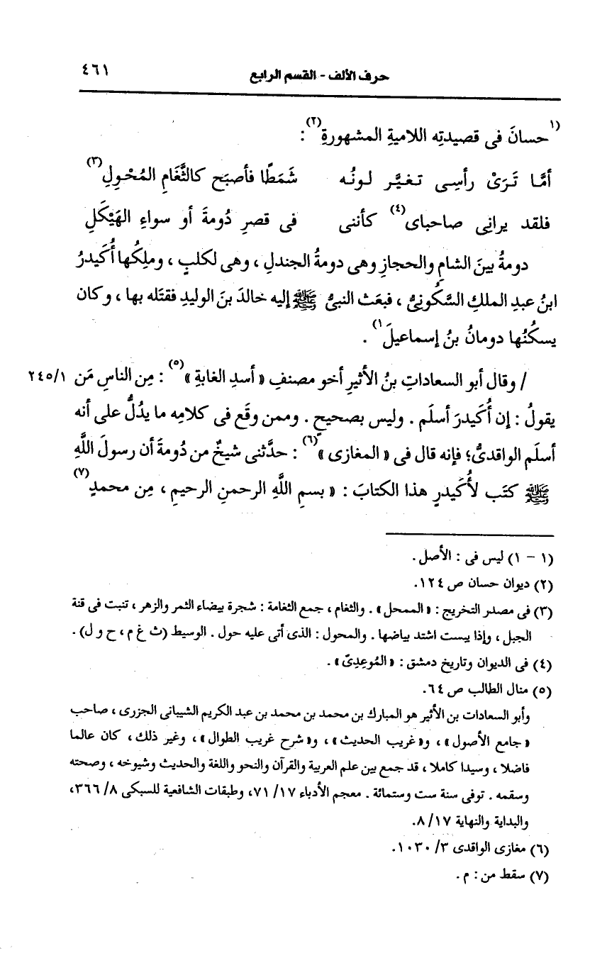 وقال أَبو السعادات ابن الأَثِير أخو مصنف "أُسْد الغابة" من الناس من يقول إن أكيدر أسلم وليس بصحيح وممن وقع في كلامه ما يدل على أنه أسلم الواقدي فإنه قال في المغازي حدثني شيخ بن دومة أن رسول الله صَلى الله عَلَيه وسَلم كتب لاكيدر هذا الكتاب بسم الله الرحمن الرحيم من رسول الله لاكيدر حين جاء الإسلام وخلع الأنداد والأصنام مع خالد بن الوليد سيف الله في دومة الجندل يقيمون الصلاة ويؤتون الزكاة عليكم بذلك عهد الله وميثاقه ولكم الصدق والوفاء.