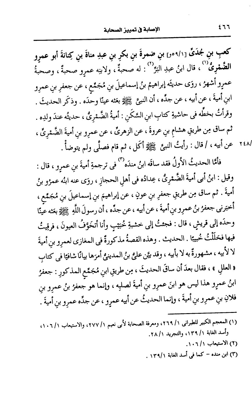 وهذه القصة مذكورة في المغازي لعمرو بن أُمَيَّة لا لأبيه مشهورة به لا بأبيه وقد بين علي بن المديني أمرها بيانا شافيا في كتاب العلل فقال بعد أن ساق الحديث من طريق ابن مجمع المذكور جعفر بن عَمرو هذا ليس، هو ابن عَمرو بن امية الضمري لصلبه وإنما هو جعفر بن عَمرو بن فلان بن عَمرو بن أُمَيَّة وانما الحديث، عَن أَبيه، عَن جَدِّه عَمرو بن أُمَيَّة.